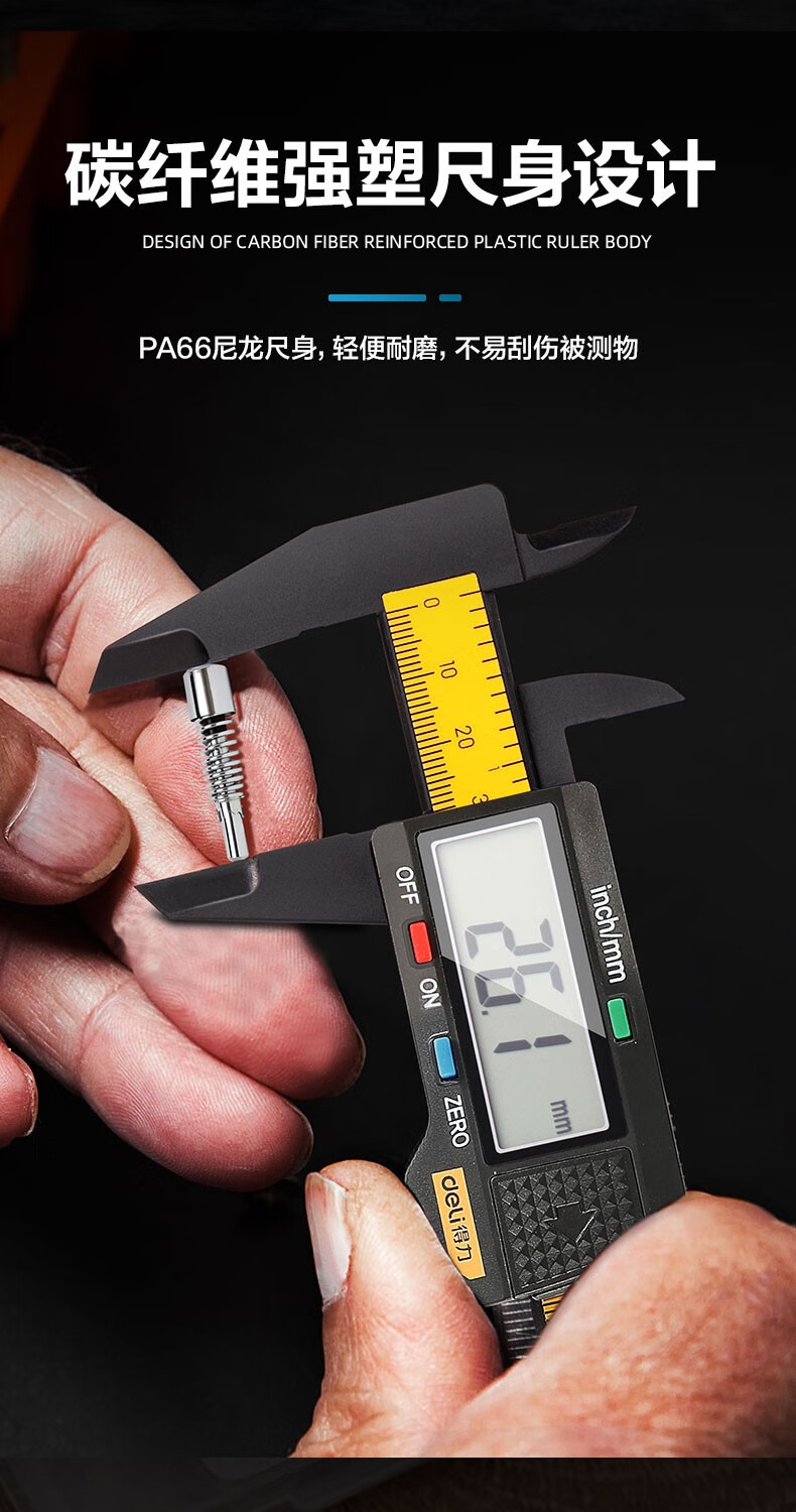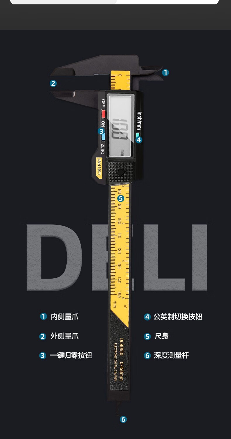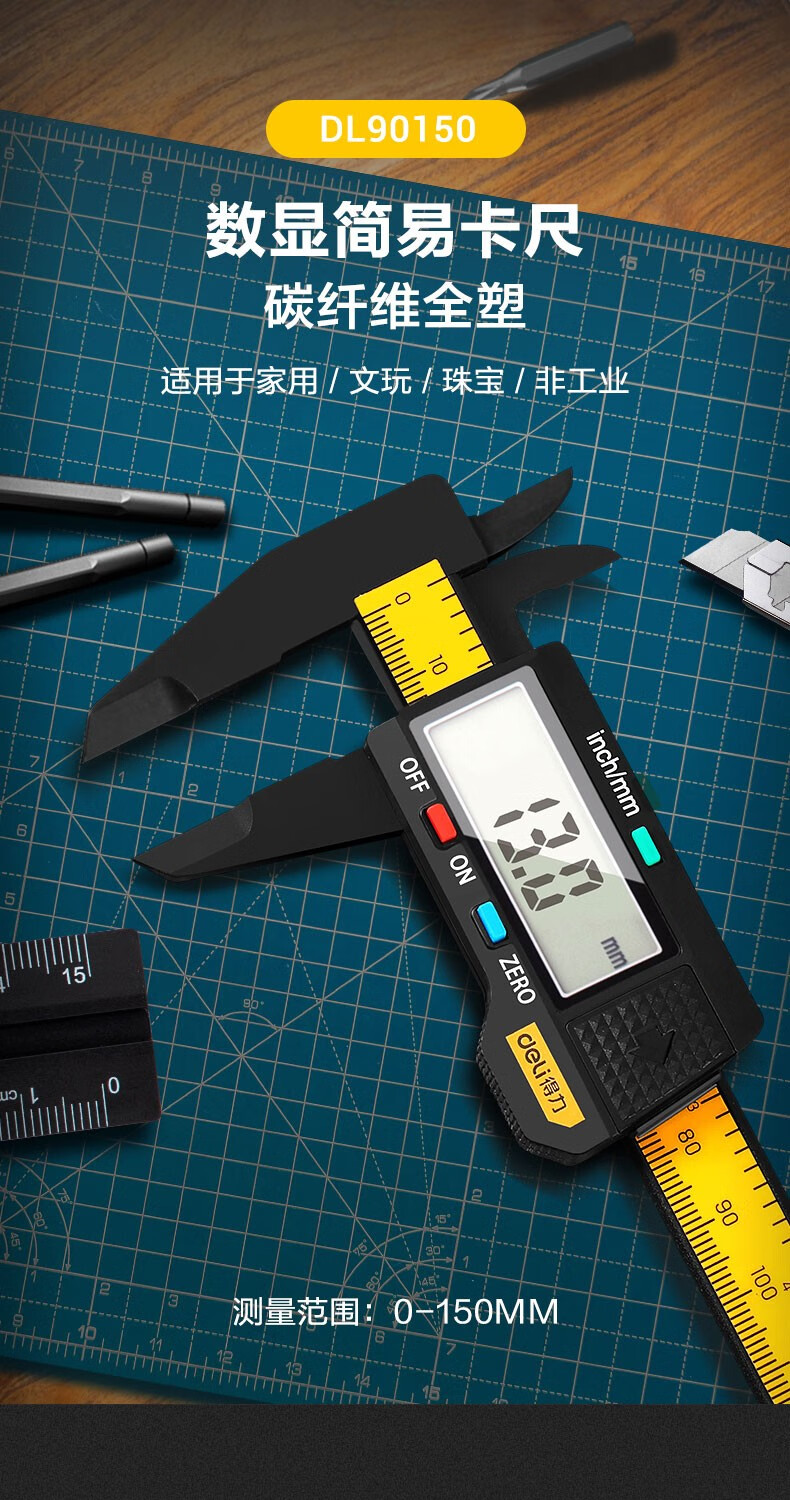 商品名稱:得力DL90150 數(shù)顯卡尺 碳纖維電子游標卡尺高精度內(nèi)外徑家用文玩古玩珠寶測量