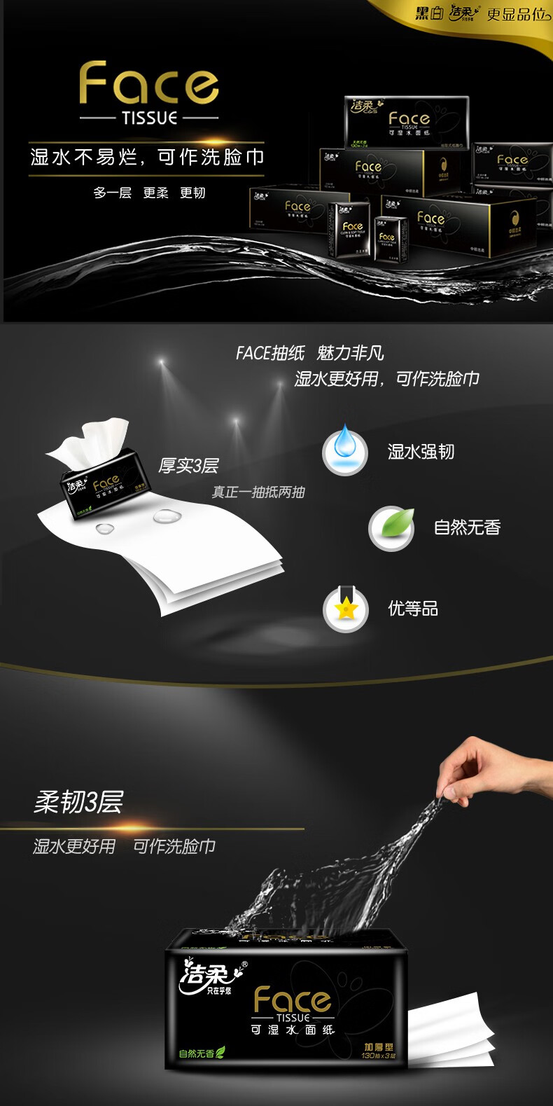 商品名稱:潔柔 抽紙 黑Face3層130抽*18包 濕水強韌 自然無香面巾紙 整箱