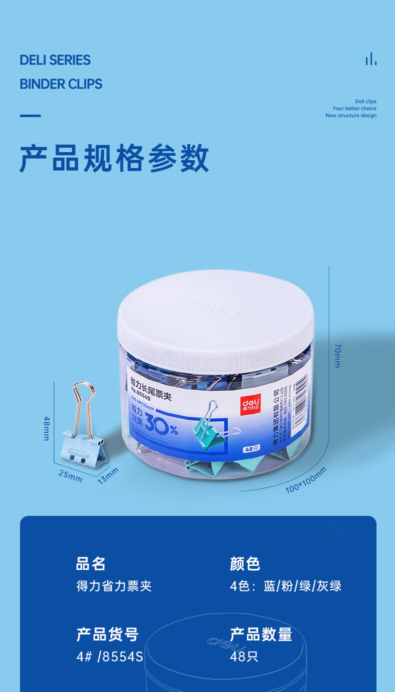 商品名稱:得力8554S 省力長(zhǎng)尾夾 4#25mm中號(hào)彩色金屬票夾燕尾夾票據(jù)文件夾子 辦公用品 48只/筒