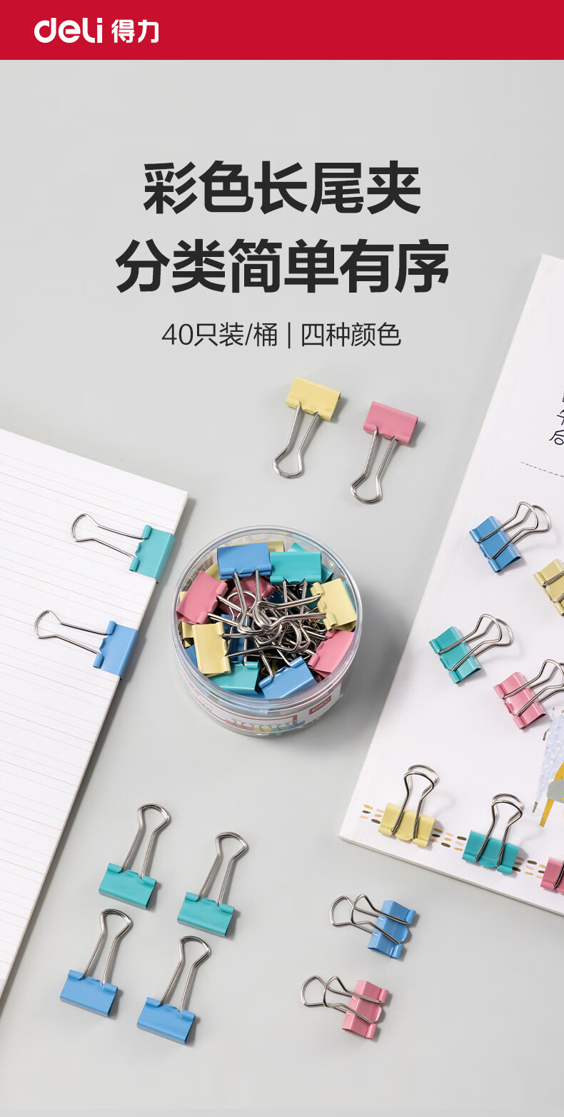 商品名稱:得力8555ES 彩色長尾夾 5#19mm小號金屬票夾燕尾夾票據(jù)文件夾子 辦公用品 40只/筒