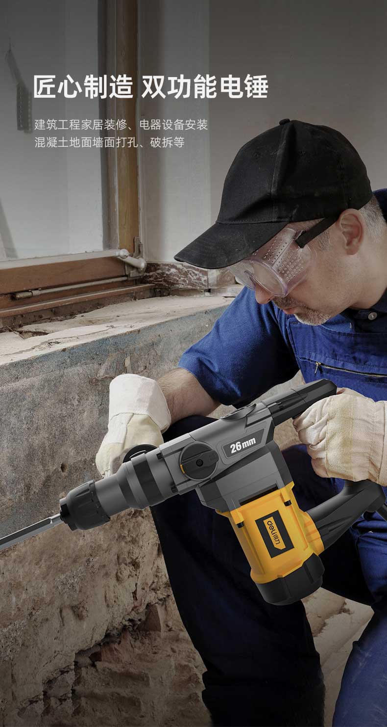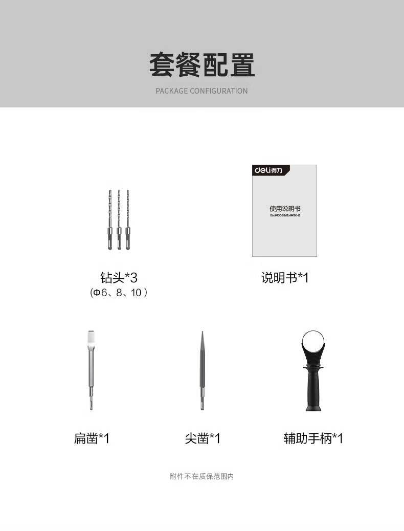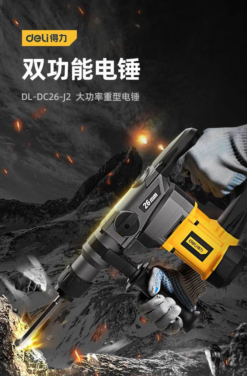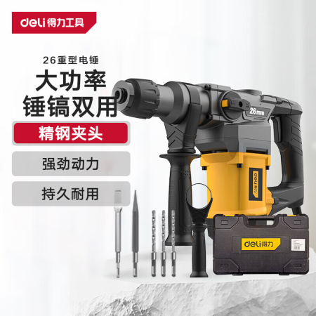 商品名稱(chēng):得力DL-DC26-J2 雙功能重型電錘大功率沖擊鉆 多功能電鉆錘鎬兩用混凝土開(kāi)鑿套裝