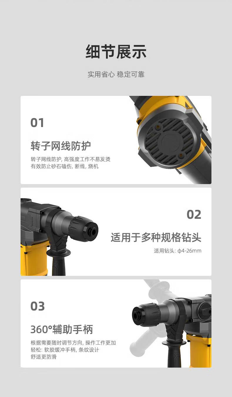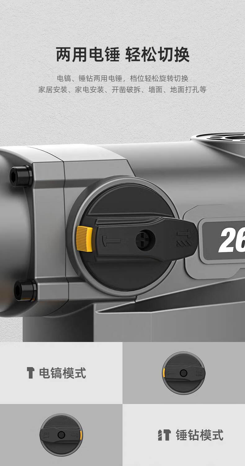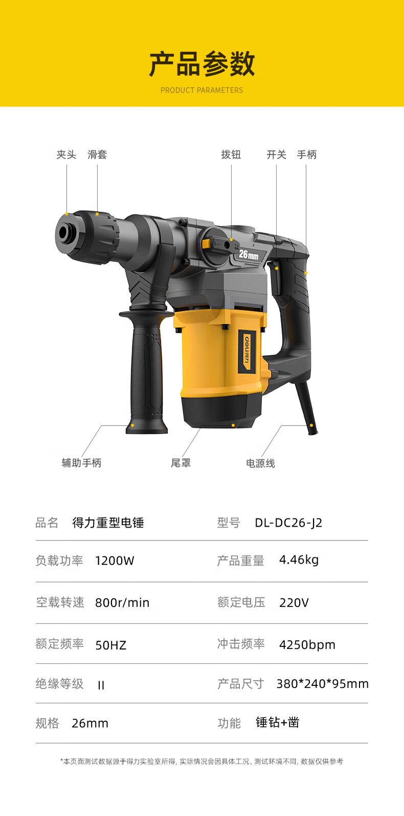 商品名稱(chēng):得力DL-DC26-J2 雙功能重型電錘大功率沖擊鉆 多功能電鉆錘鎬兩用混凝土開(kāi)鑿套裝