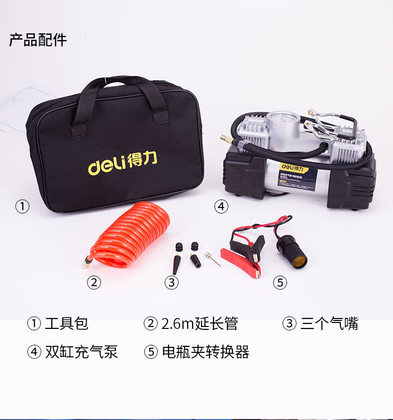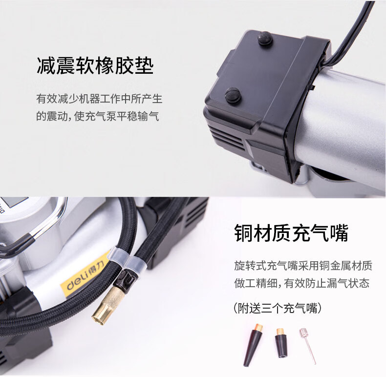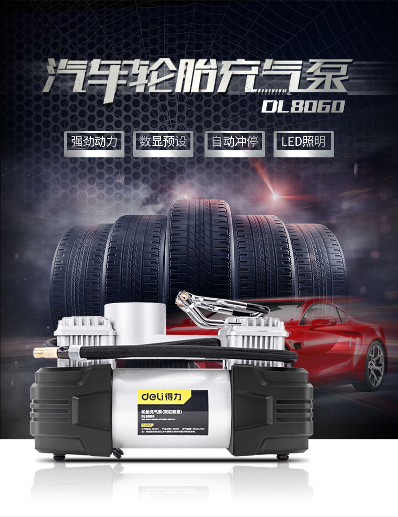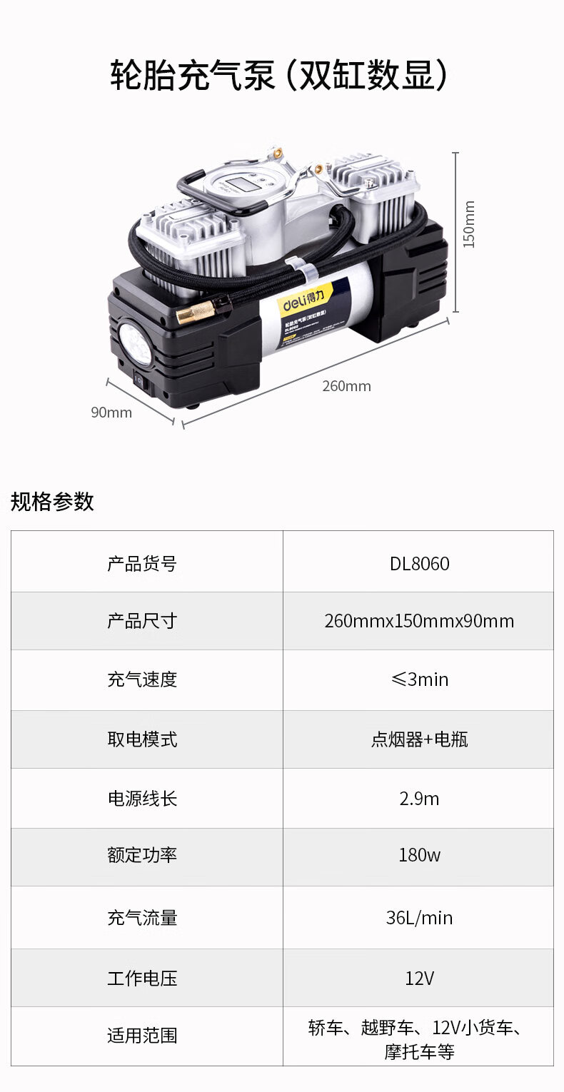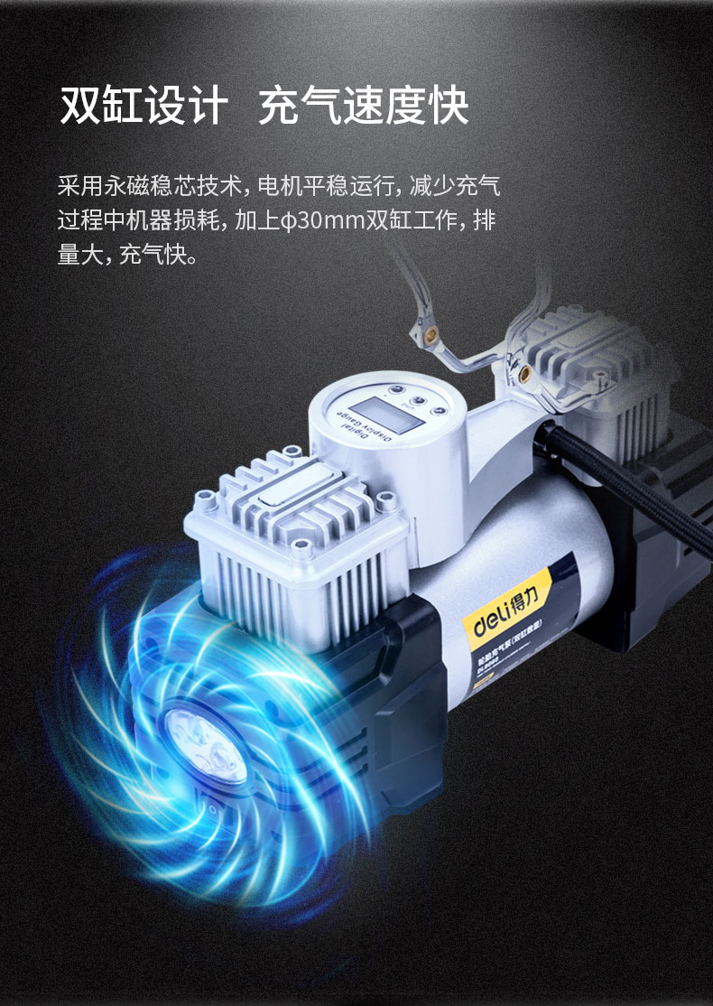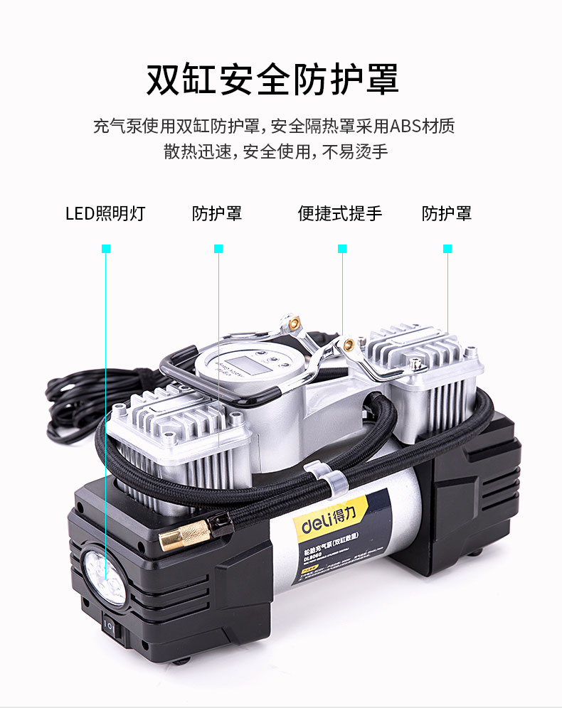 商品名稱:得力DL8060 車載充氣泵 雙缸高壓便攜式轎車輪胎家車用打氣泵筒電動汽車 雙30缸數(shù)顯預設胎壓充氣泵