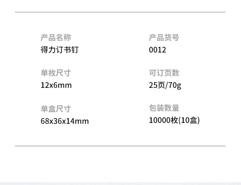 商品名稱:得力0012 高強(qiáng)度訂書釘 12#訂書針 1000枚/盒 10盒裝 辦公用品