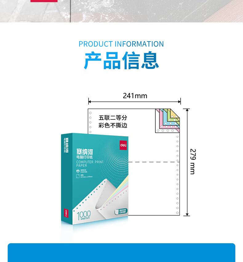 商品名稱:得力N241-5 塞納河針打式電腦打印紙 五聯(lián) 二等分 彩色撕邊