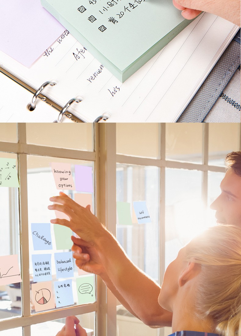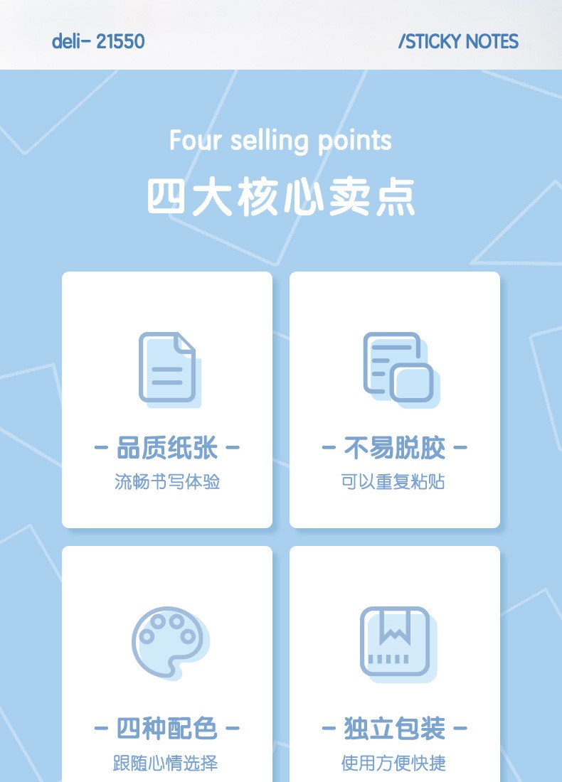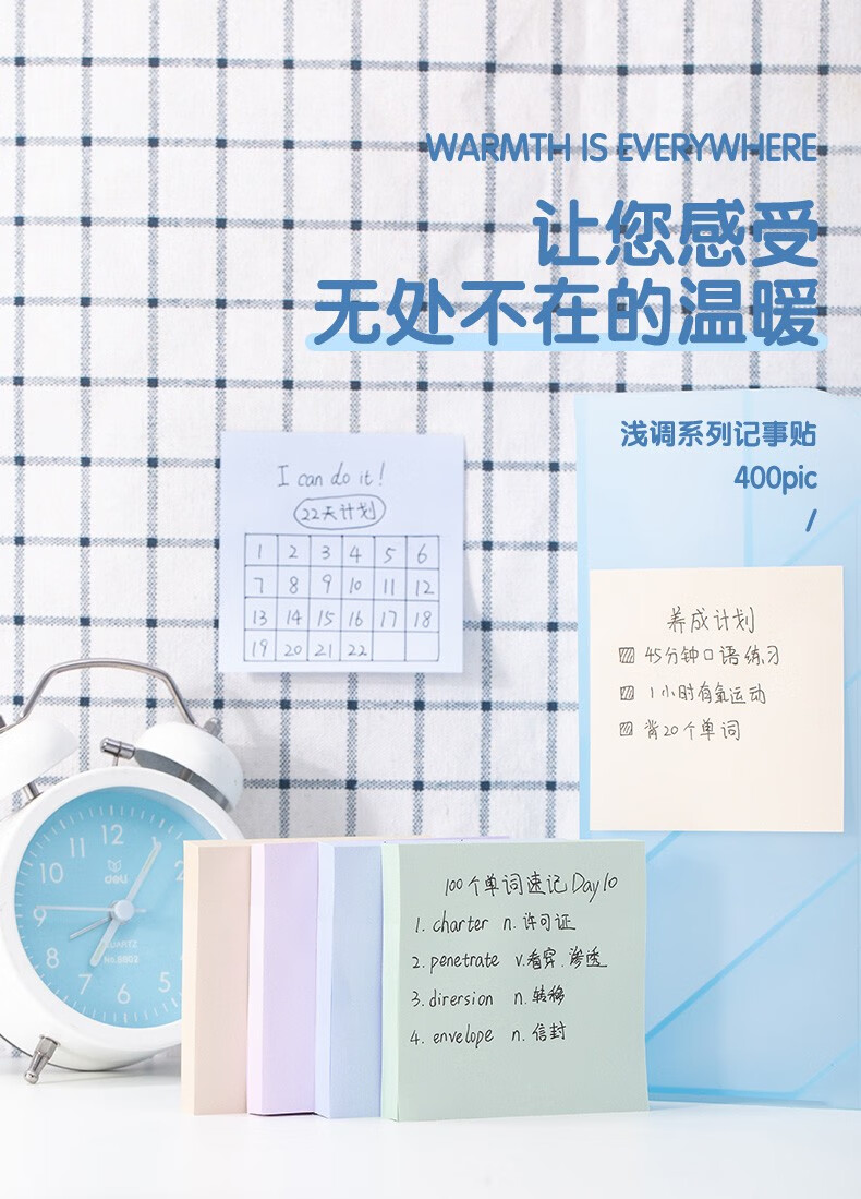 商品名稱:得力21550 便利貼 4色淺調(diào)系列淡彩簡約便簽本 76*76mm記事貼/自粘留言本 400張/袋