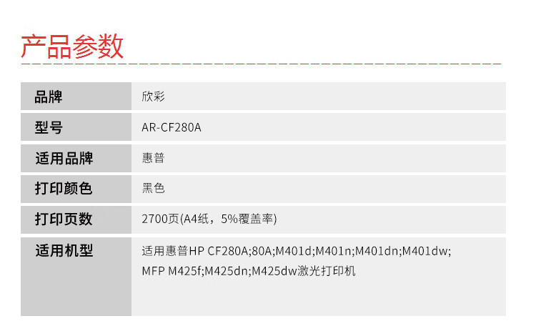 商品名稱:欣彩AR-CF280A硒鼓 大眾版 適用惠普HP CF280A 80A M401d M401n M401dn M401dw MFP M425f M425dn激光打印機(jī)
