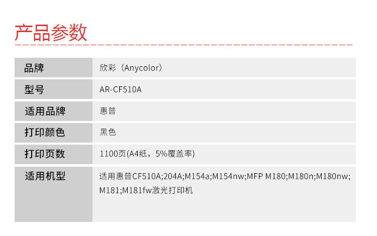 商品名稱:欣彩AR-CF510A黑色硒鼓 大眾版 適用惠普CF510A 204A M154a M154nw MFP M180 M180n M180nw M181