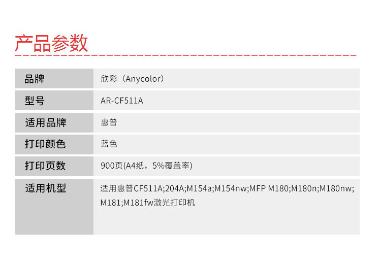 商品名稱:欣彩AR-CF511A藍色硒鼓 大眾版 適用惠普CF511A 204A M154a M154nw MFP M180 M180n M180nw M181