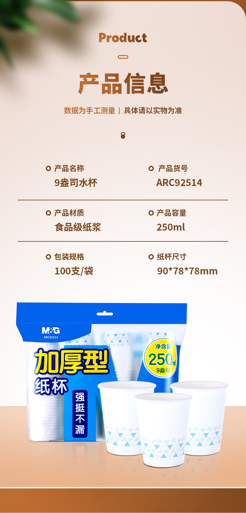 商品名稱:晨光250ml加厚型紙杯 9盎司一次性水杯茶水杯子 100只/袋ARC92514